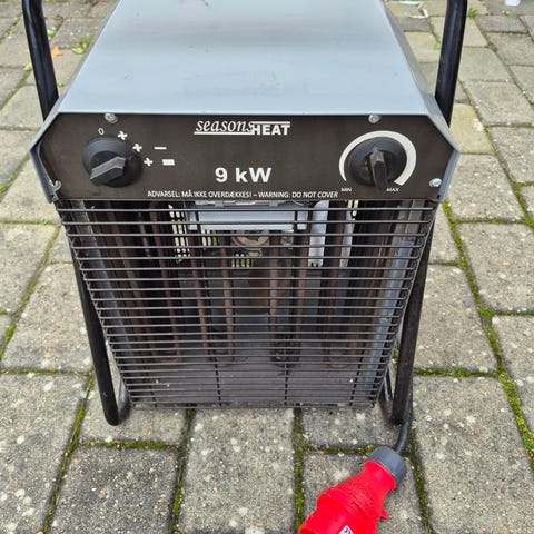 Seasonheat Varmblæser 9 kW elektrisk varmblæser med sort metalhus. Udstyret med ventilator og termostat til regulering af varmeeffekt. Tilsluttes med kraftig rød industristikprop. Velegnet til opvarmning af mindre rum eller byggepladser.