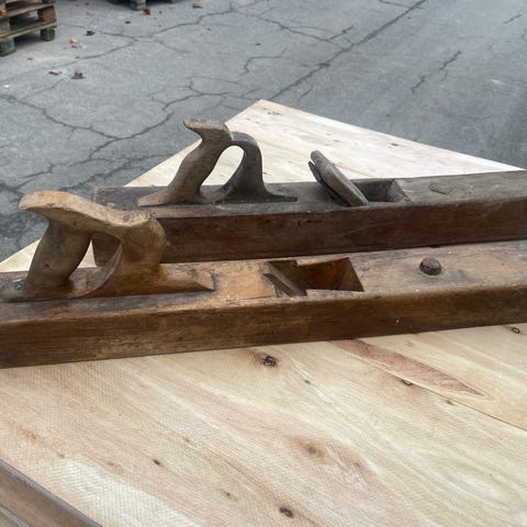 Sæt af gamle træhøvle i forskellige størrelser og designs. Fremstillet af træ med metaldele til justering og fastgørelse. Velegnet til håndværksbrug og træbearbejdning. Fuldt funktionsdygtige.
