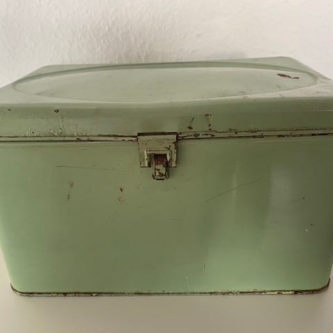 Der er her tale om en fin retro brødkasse i hvid metal m. gråænder som dekoration. Formodentlig produceret i 1970'erne. Har patina men er fuldt funktionel.