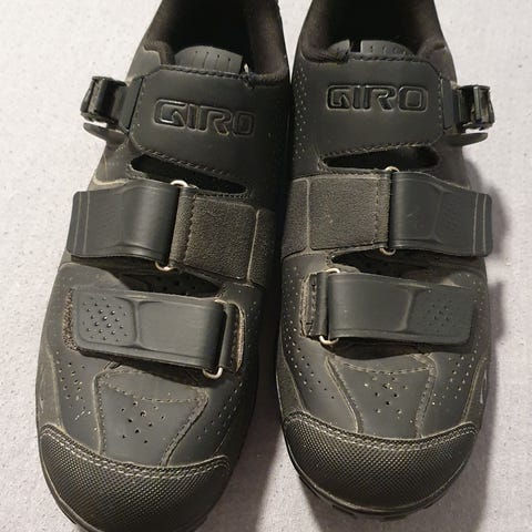 Giro mountain bike sko i størrelse 48. Skoene er grå og sorte med en kombination af snørebånd og velcrolukning for ekstra sikkerhed. Overfladen er perforeret for åndbarhed, og sålen er udstyret med Vibram gummi for bedre greb og holdbarhed. Skoene er designet til cykelbrug og har plads til klikpedaler.