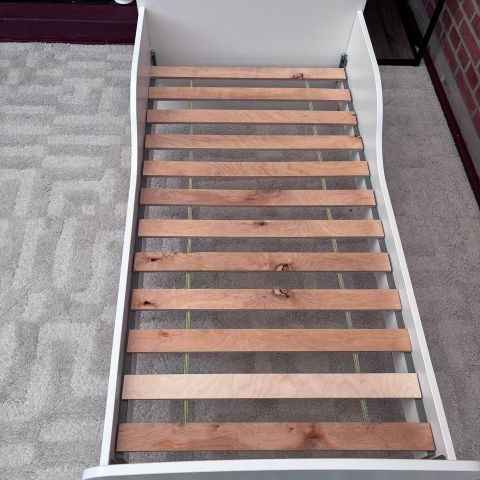 Juniorseng med madras. 140 cm lang og 70 cm bred. Fungerede godt i en mindre lejlighed til børn op til 7 år. Har mærker og skrammer fra brug. Var oprindeligt den nederste halvdel af en køjeseng, så der er høje stolper. Vi har tilføjet noget træ rundt om toppen, som kan dekoreres med gardiner eller lignende. Kan nemt skilles ad for lettere transport.