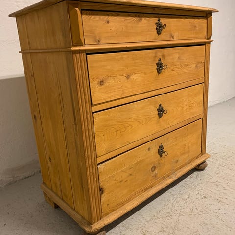 Kommode i fyr med fire skuffer med udtræk. Hver skuffe er foret med fint blomster blad tapet.