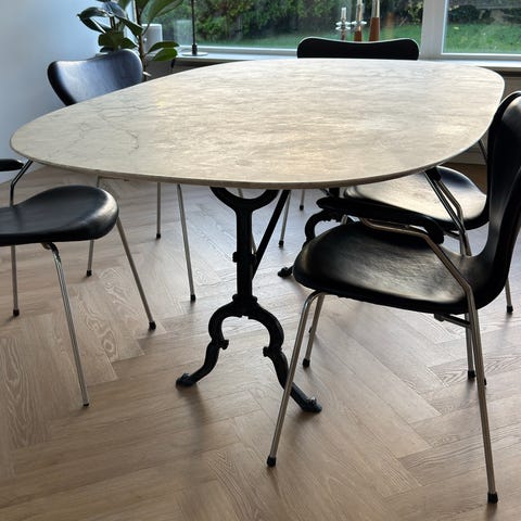 Smukt gammel aflangt marmor spisebord med krom stål farvet stel.