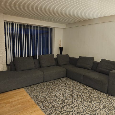 Lækker og velholdt hjørnesofa med ekstra puf, grå velour, min. 8 pers. fra Designers Guild. Model Lino med brede armlæn. Moduler der kan tages fra hinanden. På billederne 330 x 293 cm. Puf 90 x 75 cm. Satinpolerede stålben. Betræk: Designers Guild Zaragoza graphite FDG2333/25. Nypris 78.000 kr. Modulsofa med ottoman og to marmorborde i grå velour. Sofaen har en L-formet opstilling med dybe sæder og bløde ryglæn. Bordene har firkantede marmorborde med sorte metalstel. Sofasættet er velegnet til stuer med behov for fleksibel siddeplads og moderne design.