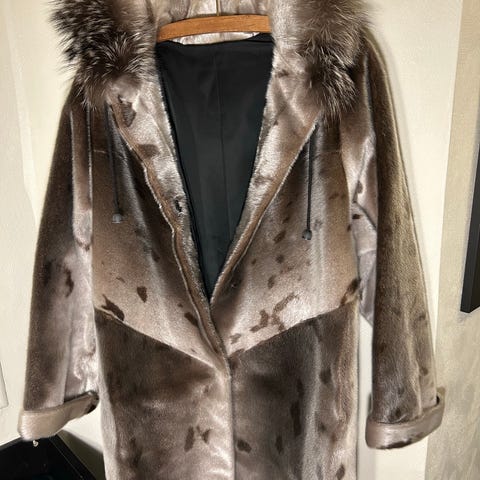 Super smuk frakke (sælskind) med ægte pels på hætten.