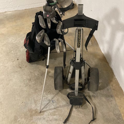 Jeg har en golf- vogn, back samt 4 drivers og 2 jern som jeg gerne vil sælge samlet for 1.100kr.