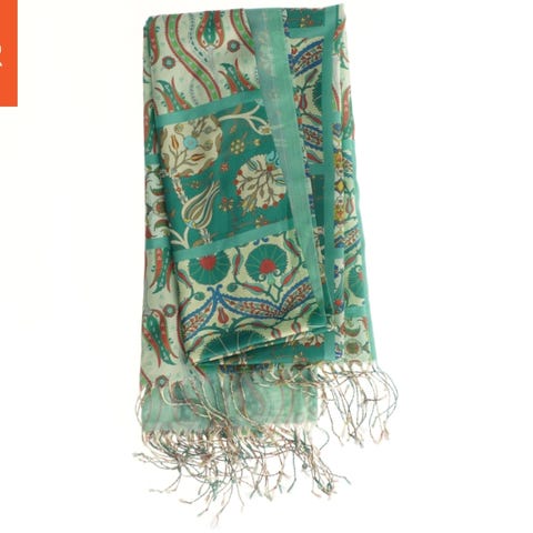 Tørklæde med bladmønster i forskellige nuancer af grønne og røde farver på en lys baggrund. Tørklædet måler 85x85 cm og har et dekorativt design med blade og blomster. Bladmønsteret virker inspireret af naturlige temaer, hvilket giver tørklædet et unikt og stilfuldt udseende. Det kan bruges som modetilbehør eller som et dekorativt element i hjemmet. Tørklædet er let og kan foldes eller draperes på forskellige måder.