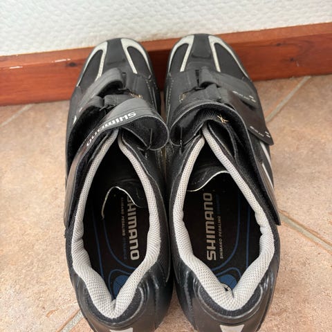 Shimano cykelsko herre i størrelse 43, sort og grå farve. Skoene har velcrolukning og er designet til cykling med et klikpedal system med SPD-SL-klamper (cleats).