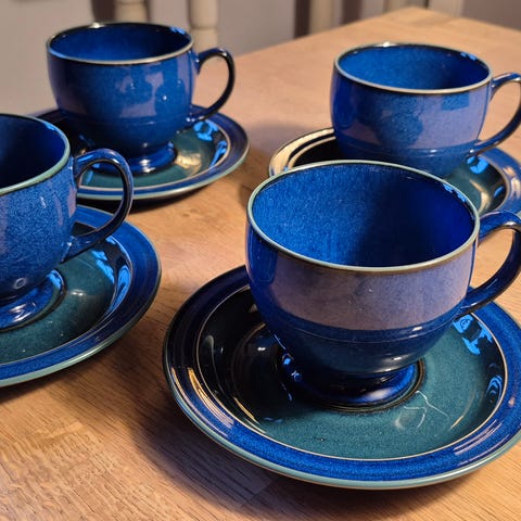 Yndigt sæt bestående af 6 vintage kaffekopper og underkopper i forskellige pastelfarver med guldkant. Glaskopperne er af opalglas fra 60’erne og disse er i den mellemstore størrelse, som passer til kaffe, te og kakao.
