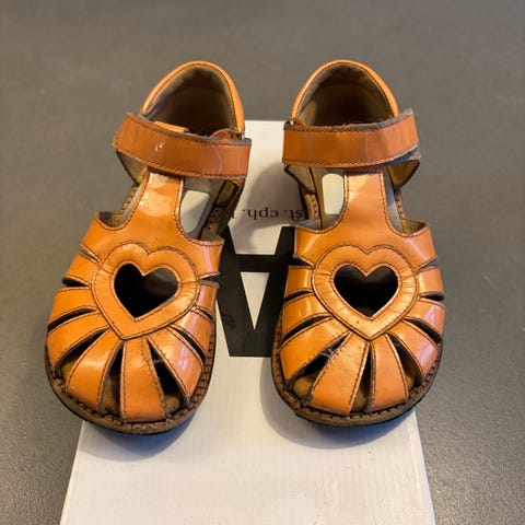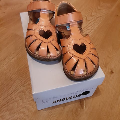 Angulus Børnesandaler til pige i størrelse 26. Skoene er lyserøde og lavet af læder. Sandalerne har en åben design med hjerteudskæringer og lukkes med velcrorem. Sålerne viser brugsspor, men skoene er velegnede til dagligt brug.