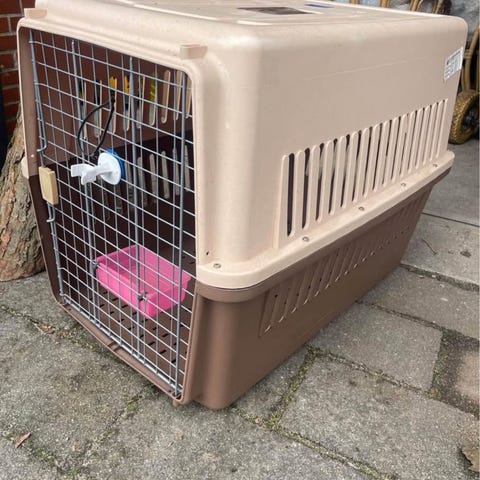 Transportbur til hund, fremstillet i plast med metalgitterdør. Buret har ventilationsåbninger på siderne og en låsbar frontdør.
