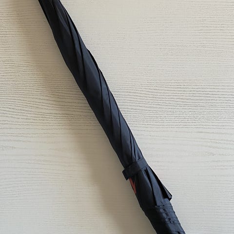Rigtig pæn paraply, sort med sølvgrå kant og sølvgrå indvendig i paraplyen. Blød skum håndtag. Ø ca. 105 cm. Totallængde 82 cm. Har reklamemærke.