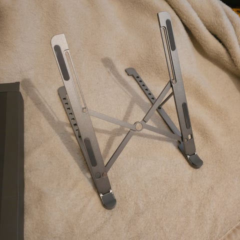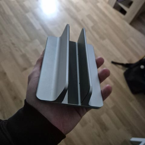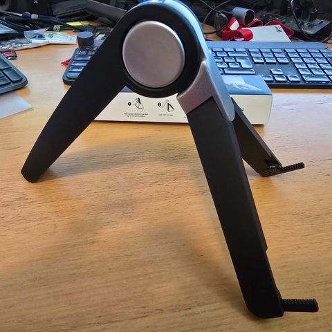 Andet laptop stand i sort metal designet til at holde bærbare computere. Standen har en rund base og en hævet platform, som giver plads til ventilation og forbedrer ergonomien ved brug af bærbar computer. Materialet er robust metal, og designet sikrer stabilitet under brug.