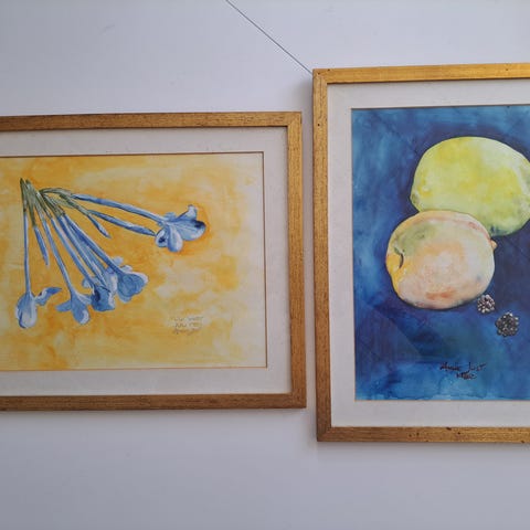 To malerier af Anne Just. Anno 1988 Det ene hedder "lige en mere".