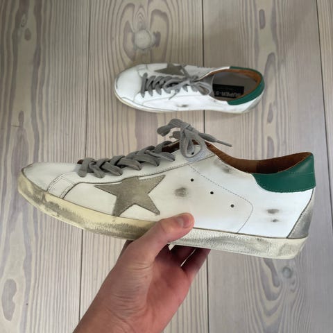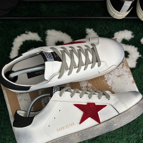 Et par af de nye populære Golden Goose forty2, købt i butikken i Paris i oktober 2024. Gået med omkring 30 gange. Holder sig godt. Alt OG medfølger. Der er 2 små flaws bagpå (intet synligt), hvilket kan laves. Det kom da mine føder nok var en smule for små til dem.