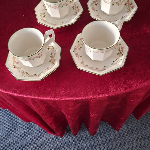 4 thekopper og 8 kaffekopper med underkopper fra Johnson Brothers, stel: Heritage White, der udgik af produktion i 0'erne.