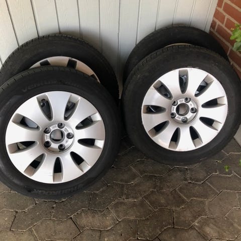 Audi Dæk med fælge, sæt bestående af 4 stk. Dækkene er sorte og monteret på fælge. Passer til Audi biler. Dækkene viser slid og brugstegn.