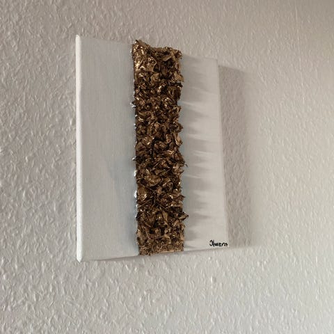 Abstrakt akryl håndlavet maleri med en blanding af grønne, blå, grå og guld nuancer. Maleriet har et flydende, marmoreret mønster og er indrammet i en sort ramme.