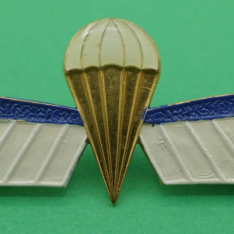 HVID FALDSKÆRMSVINGE I METAL MED RØD FOR FRITFALDSSPRING, BRUGES VED GA4DEHUSARREGIMENTETS HESTEESKADRON HESK