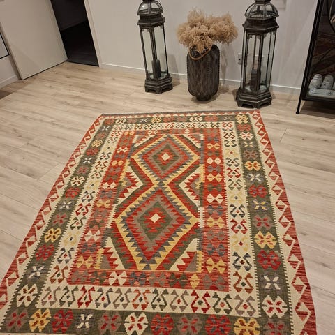 Smukt tæppe i klassisk geometrisk kilim-stil med mange farver.