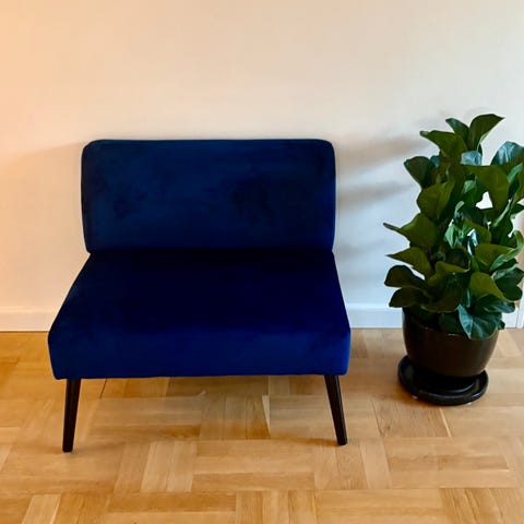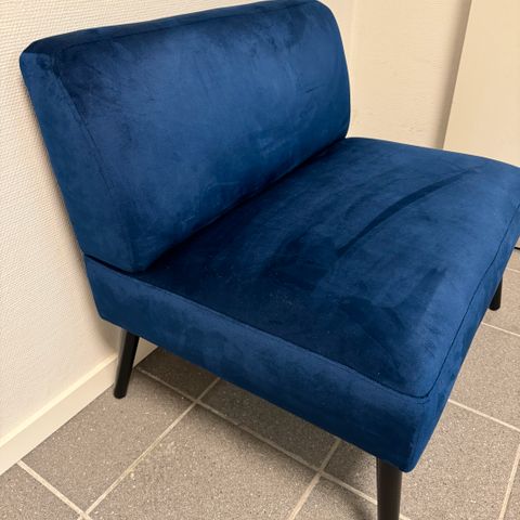 Betrækket er i blødt velourstof i en blå farve, og stellet er sandsynligvis i krom eller et lignende metal, som det ses på billedet.