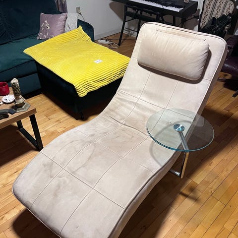 Den har rene linjer og en ergonomisk form, der understøtter kroppen i en tilbagelænet position.