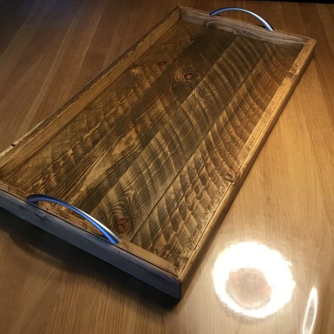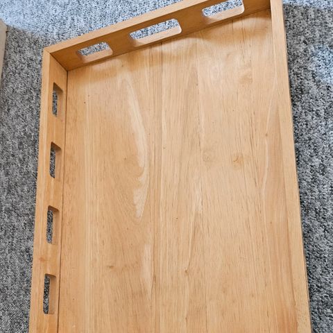 2 (ens) serveringsbakker i lakeret fyr, med amr valnød håndtag.