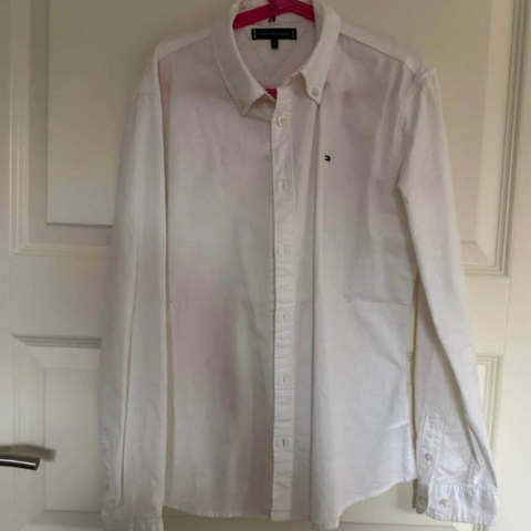 Hvid skjorte i tyk kvalitet fra Tommy Hilfiger. Størrelse 12-14 år. Brugt få gange, men skal lige stryges. 98% bomuld, 2% elastan.