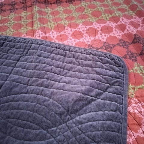 Quiltet vattæppe i 100 % bomuld. Blomstret mønster i lilla og lyseblå. Forstærkede kanter.