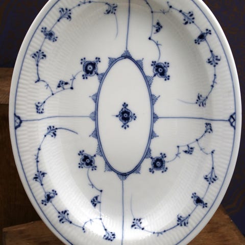 Bladformet fad fra Royal Copenhagen. Stemplet indikerer det er lavet mellem 1894 og 1922. Det er første sortering.
