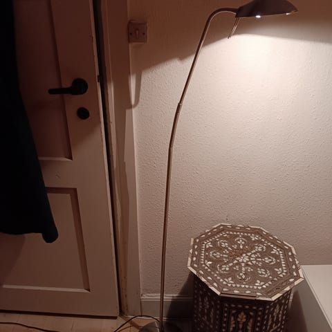 Fin stålampe/ læselampe der kan stilles efter behov. Lysstyrke stilles ved at træde på ledningsknap.