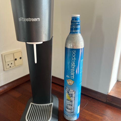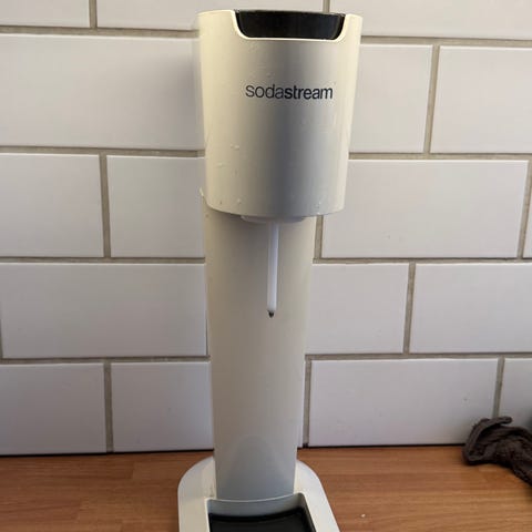 FEJLKØB Sodastream Terra sodavandsmaskine i hvid farve. Maskinen bruges til at lave danskvand ved at tilsætte kulsyre til almindeligt vand. Den har et enkelt og slankt design, der passer til de fleste køkkener.