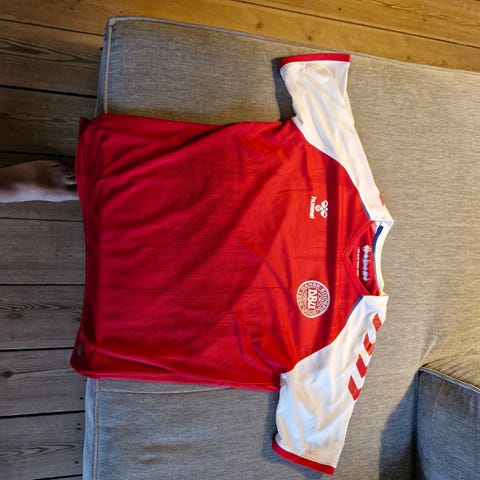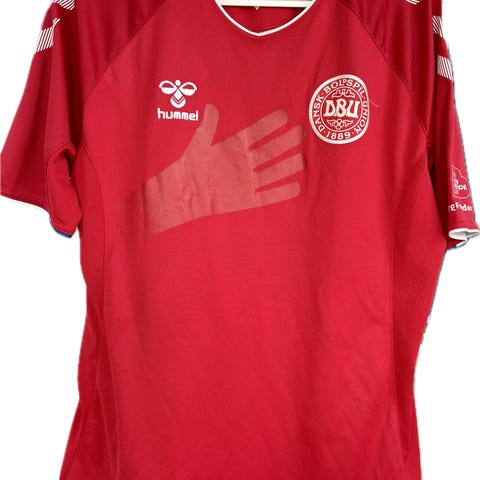 Hummel Danmark fodboldtrøje i størrelse XXXL. Trøjen er rød med hvide ærmer og har logoer fra Hummel og det danske fodboldforbund. Materialet er let og velegnet til sportsbrug. Trøjen har detaljer som trykte slogans og officiel autenticitetsmærkat.