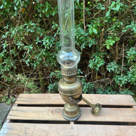 Ældre skibslampe/ loftslampe i messing, til olie. Til ophæng. Med væge og glas.