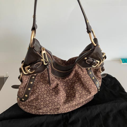 DKNY taske i kunstlæder designet til kvinder. Tasken har et rummeligt hovedrum med lynlås og indvendige lommer til opbevaring. Den har to skulderstropper og metalbeslag for holdbarhed. Farven er sort med et diskret mønster og et tilføjet tørklæde som pynt. Tasken er egnet til daglig brug og kan rumme personlige ejendele sikkert.