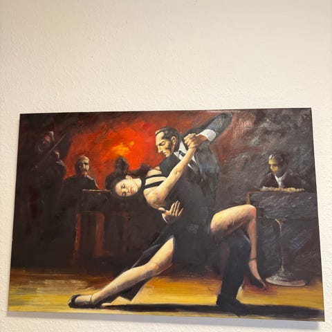 Maleri af et tango dansende par med en mand i hvidt jakkesæt og en kvinde i rød kjole. Baggrunden viser silhuetter af andre dansere i mørke farver. Vægkunst med fokus på bevægelse og dans. Mener det er olie, men det kan også være akryl.