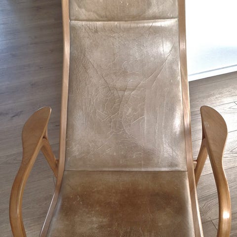 Super elegant lænestol med skammel i lys læder(ikke hvid, men jeg vil kalde den naturfarve) Har drejefunktion men ikke vippefunktion.