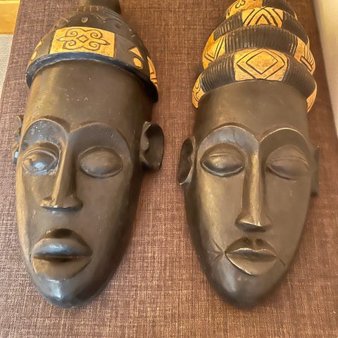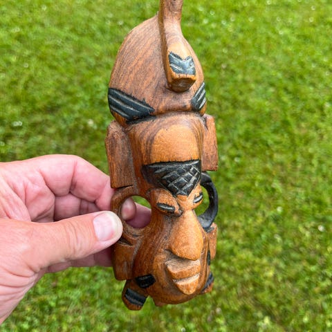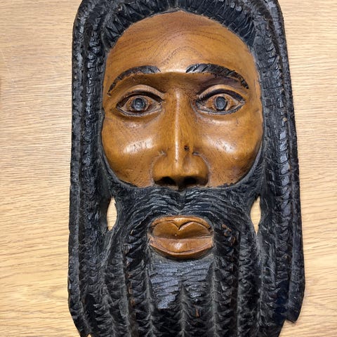 Håndskåret træmaske med afrikansk design. Masken er lavet af træ og har detaljeret udskæring med ansigtstræk. Den kan bruges som dekorativ vægdekoration eller som en del af en samling af kulturelle genstande. Træ figur solid 200 kr