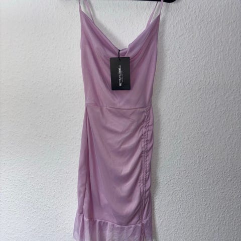 Flot, rød kjole med tynde stropper og en fin flæsekant forneden. Kjolen har en smuk drapering ved brystet, der giver et elegant udtryk.