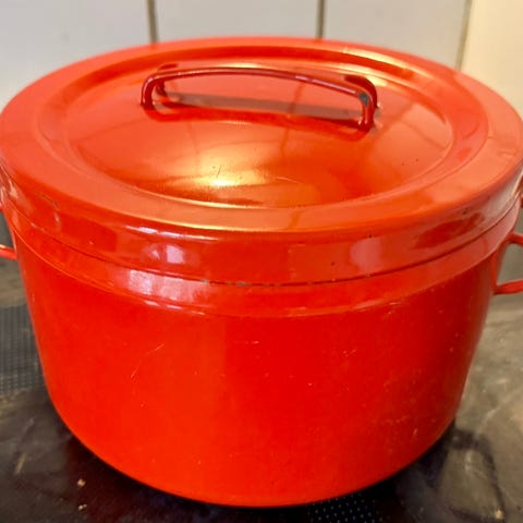 Arabia gryde med låg, kapacitet på 2,5 liter. Gryden er lavet af stål med grøn emalje udvendigt og indvendigt. Den har to håndtag og et låg med håndtag i metal. Velegnet til madlavning på komfur. Støbe jerns gryde af dansk design kan ikke husk hvad han hedder 135 kr