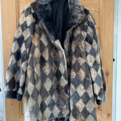 Set forfra: Med skjult nem hægteknapring. Sort sælskinskrave og lodret sort sælskinsstripe foran hægteknapper samt vandret sort sælskinsstripe og på kant af ærmer. Pelsen har 2 yderlommer.