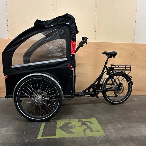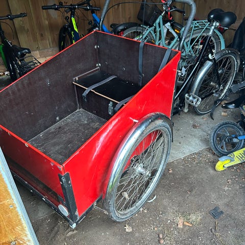 Christiania lad cykel i rigtig god stand. Ingen rust og er brugt sammenlagt i 1 år. Derefter har ladcyklen stået indendørs i et lukket og tørt cykelrum. Ladcyklen har tilkøbt ekstra udstyr som en lille bænk indeni ladet, samt med seler til 2 børn.
