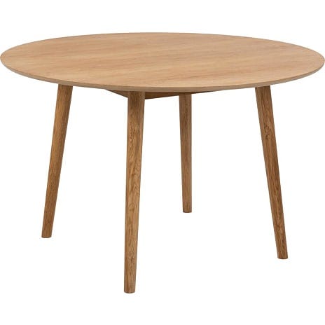 Den harmoniske helhed understreges af kombinationen af en bordplade i MDF beklædt med olieret egetræsfinér og solide ben i olieret egetræ. Materialerne spiller naturligt sammen og bidrager til en hyggelig og indbydende atmosfære.