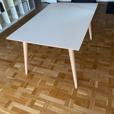 Flot spisebord med tillægsplade fra Vesterby, brugt meget lidt. Mål udslået 75x115 cm. Har en lille ridse på bordpladen, men er uden betydning. Nypris 2400kr sælges for 700kr. Sendes ikke