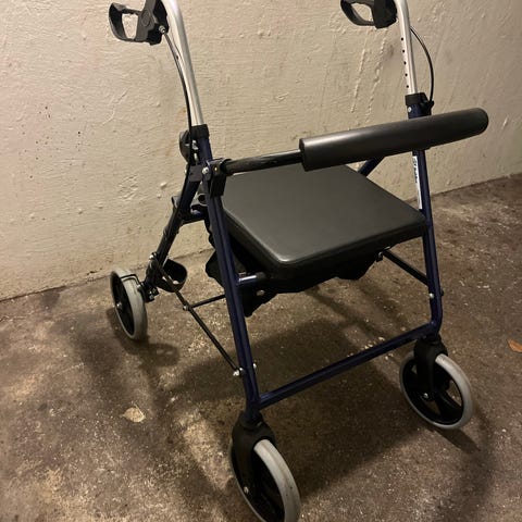 Letvægts Rollator med 4 hjul, håndbremser og sammenklappelig ramme.