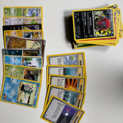Samling af Pokémon kort med forskellige typer og figurer fra Pokémon kortspil. Indeholder flere kort med varierende egenskaber, herunder angreb, forsvar og specialfunktioner. Kortene er egnet til samling eller brug i spil.