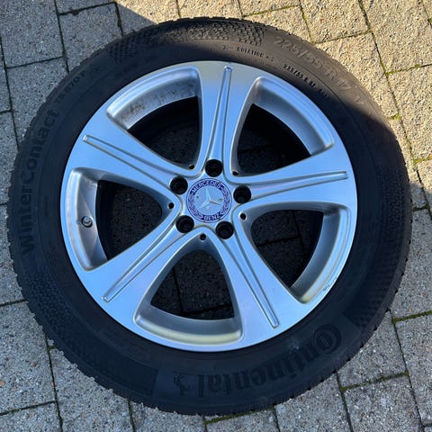 Continental Vinterdæk på originale MB aluminiumsfælge med dimensionerne 225/55 R17 H. Har siddet på en Mercedes-Benz E220, Over 6 mm tilbage - kun brugt en vinter.