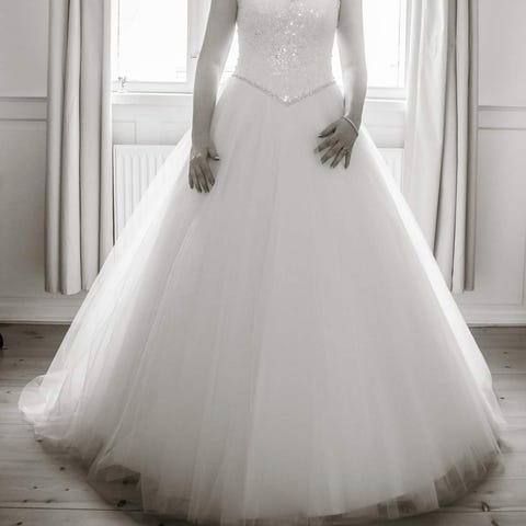 Flot og speciel brudekjole med sort perlemønster. Med slæb og slør. Nypris for brudekjole 8.000 og 1700 for slør