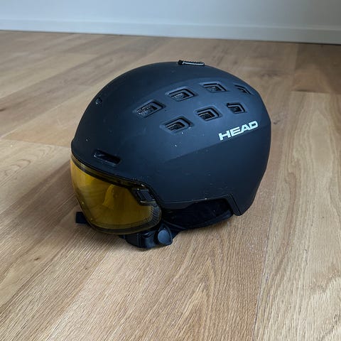 HEAD Skihjelm med indbygget skibrille i mat sort farve. Hjelmen har flere ventilationsåbninger og integreret skibrille med spejlglas. Designet til at beskytte hovedet under vintersport og sikre godt udsyn med den indbyggede skibrille. Modellen hedder Skihjelm Head Radar 5K Visor MIPS den har også mips og denkoster omkring 1400kr for ny