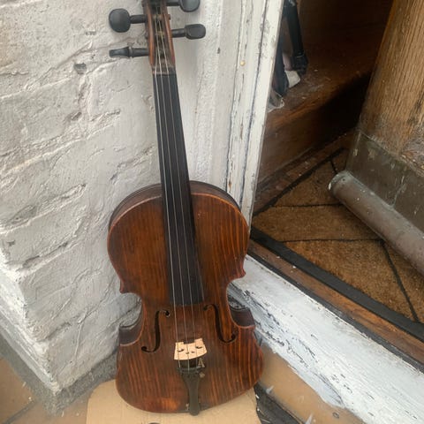 Ukendt Violin i træ med fuld 4/4 størrelse og brun finish. Instrumentet er designet til brug i klassisk musik og passer til både begyndere og øvede violinister. Den har standard violinopbygning med fire strenge og traditionel form.